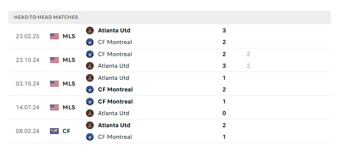 - Kèo tỷ số H2 CF Montreal vs Atlanta United: 1-0