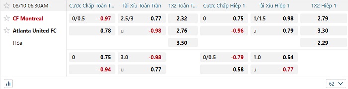 Bảng tỷ lệ kèo bóng đá hôm nay CF Montreal vs Atlanta United