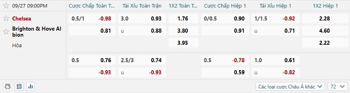 Bảng tỷ lệ kèo bóng đá hôm nay Chelsea vs Brighton