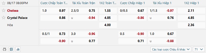 Bảng tỷ lệ kèo bóng đá Chelsea vs Crystal Palace