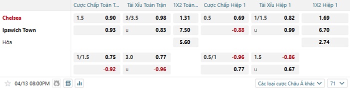Bảng tỷ lệ kèo bóng đá Chelsea vs Ipswich