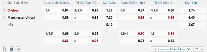 Bảng tỷ lệ kèo nhà cái Chelsea vs Man Utd