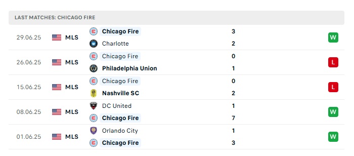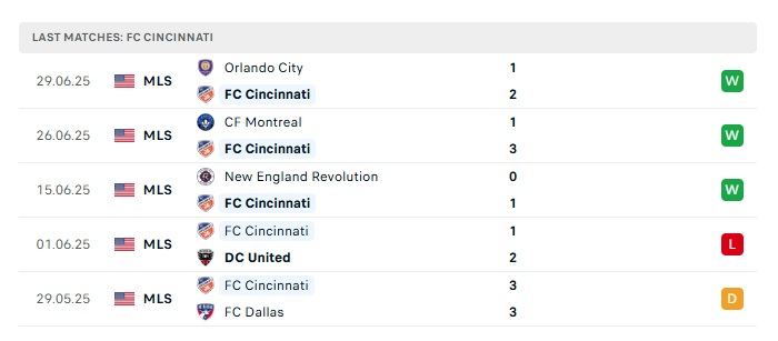 Phong độ gần đây Cincinnati  vs Chicago Fire