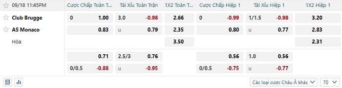 Hiện tại, nhà cái đang niêm yết cho Club Brugge và Monaco mức kèo đồng banh và ở kèo phụ thì đội khách chấp 1/4. Nên biết rằng trong 5 trận gần nhất của Club Brugge, họ chỉ thắng kèo 2 và còn lại thua 3. Trong khi đó thì Monaco đang thắng kèo 3/4 trận đấu gần nhất của mình. Như vậy, sẽ không có gì quá bất ngờ nếu như đội khách trở thành lựa chọn đầu tư an toàn nhất trong ngày thi đấu hôm nay.