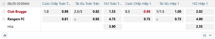 Bảng tỷ lệ kèo nhà cái Club Brugge vs Rangers