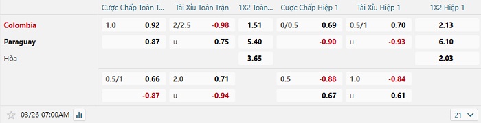 Bảng tỷ lệ kèo bóng đá Colombia vs Paraguay