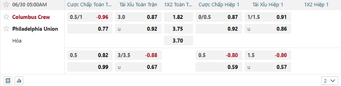 • Kèo tỷ số H1 Columbus Crew vs Philadelphia Union: 0-0