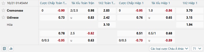 Soi kèo châu Á, kèo Cremonese vs Udinese