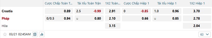 Bảng tỷ lệ kèo bóng đá Croatia vs Pháp