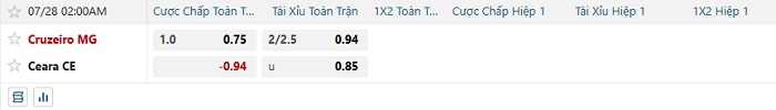 • Kèo tỷ số H1 Cruzeiro vs Ceara: 1-0