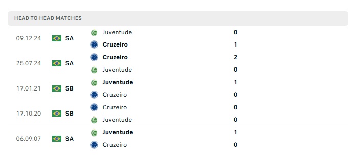 Lịch sử đối đầu Cruzeiro vs Juventude