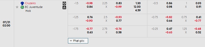 - Kèo tỷ số H1 Cruzeiro vs Juventude: 1-0
