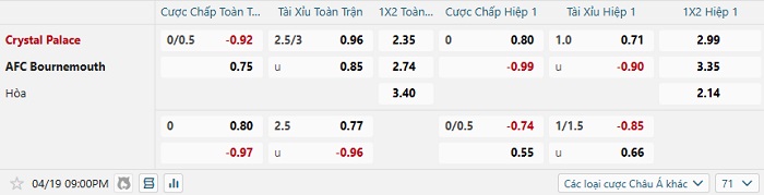 Bảng tỷ lệ kèo nhà cái Crystal Palace vs Bournemouth
