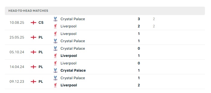 Lịch sử đối đầu Crystal Palace vs Liverpool