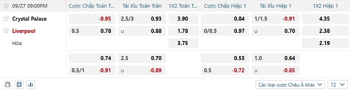 Bảng tỷ lệ kèo nhà cái Crystal Palace vs Liverpool