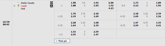 Bảng tỷ lệ kèo bóng đá Derby County vs Leeds Utd