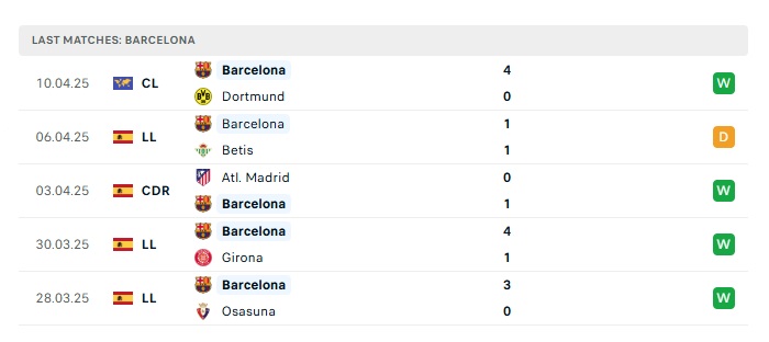 Phong độ gần đây Dortmund vs Barcelona