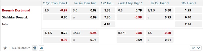 Bảng tỷ lệ kèo bóng đá Dortmund vs Shakhtar Donetsk