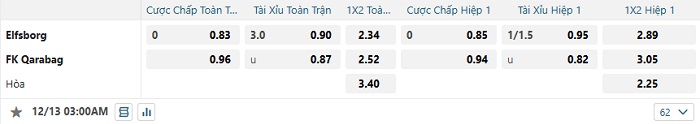• Kèo tỷ số H1 Elfsborg vs Qarabag: 0-0