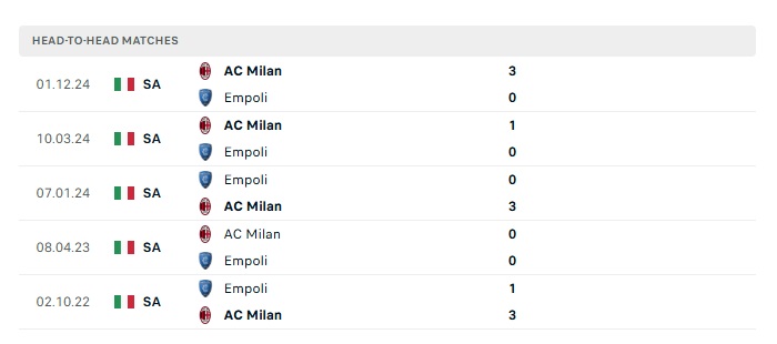 - Kèo tỷ số H2 Empoli vs AC Milan: 1-3