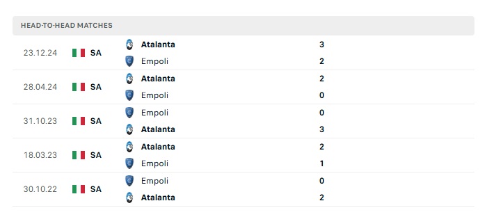Lịch sử đối đầu Empoli vs Atalanta