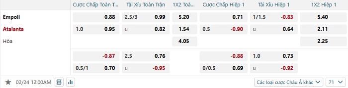 Bảng tỷ lệ kèo bóng đá Empoli vs Atalanta