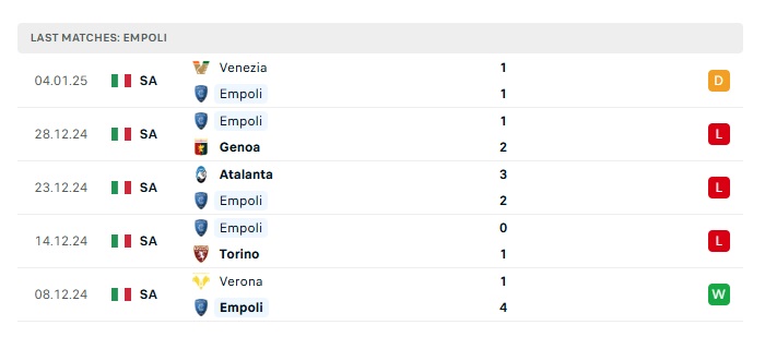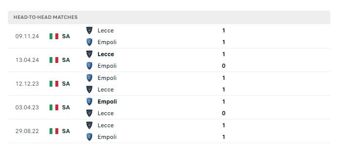 Theo ghi nhận từ các chuyên gia, thời gian qua cả hai đội đều có thành tích thi đấu không tốt giống nhau.Tính trong 7 trận gần nhất của Empoli, đội chủ nhà chỉ thắng 1, hòa 2 và thua 4 trận còn lại. Trong khi đó thì 6 trận gần nhất của Lecce, họ cũng chỉ thắng 1, hòa 2 và thua 3 trận còn lại. Do đó, nếu như trận đấu này khép lại với kết quả Hòa thì đó cũng là 1 kết quả hoàn toàn dễ hiểu.