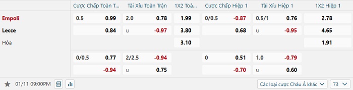 Bảng tỷ lệ kèo bóng đá Empoli vs Lecce