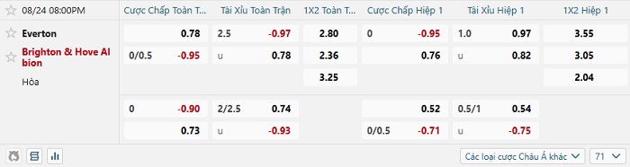 - Kèo tỷ số H1 Everton vs Brighton: 0-1