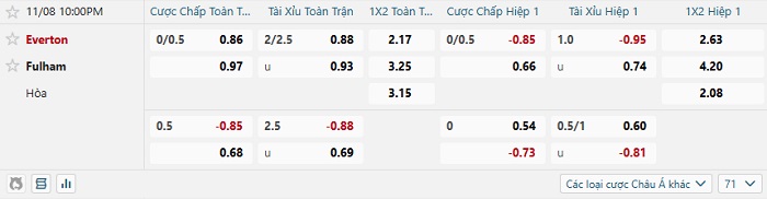 Hiện tại, nhà cái đang niêm yết cho Everton mức chấp -1/4 và khả năng để họ thắng kèo lúc này là rất thấp. Trong 6 trận đấu đã qua của Everton, họ được ghi nhận chỉ có đúng 1 trận thắng kèo. Và trong 6 lần đụng độ nhau gần nhất với Fulham, Everton cũng chỉ thắng kèo 1. Do đó, kèo châu Á trận đấu hôm nay sẽ có đội khách là lựa chọn tốt nhất trong cả 2 hiệp.