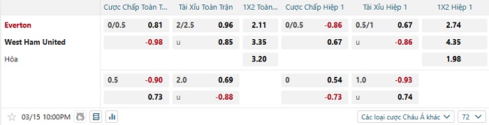 Bảng tỷ lệ kèo bóng đá Everton vs West Ham Utd