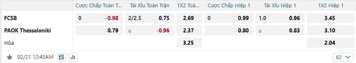 • Kèo tỷ số H2 FCSB vs PAOK: 0-0