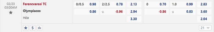 Bảng tỷ lệ kèo bóng đá Ferencvaros vs Olympiacos Piraeus