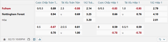 Bảng tỷ lệ kèo bóng đá Fulham vs Nottingham Forest