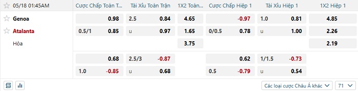 Bảng tỷ lệ kèo bóng đá hôm nay Genoa vs Atalanta