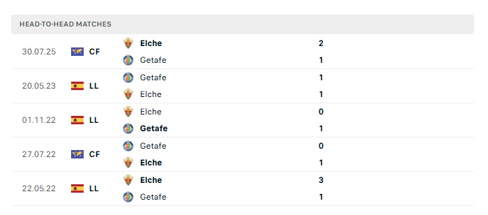 Lịch sử đối đầu Getafe vs Elche