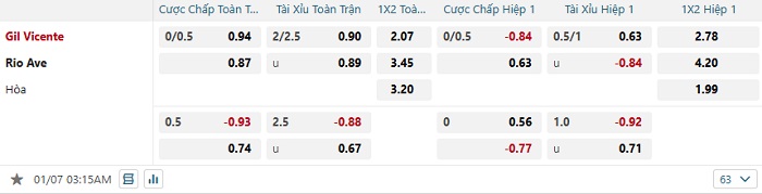 Bảng tỷ lệ kèo bóng đá Gil Vicente vs Rio Ave