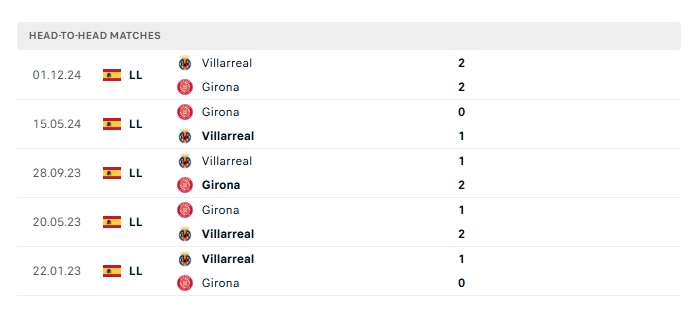 - Kèo tỷ số H2 Girona vs Villarreal: 0-1