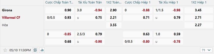 Bảng tỷ lệ kèo bóng đá hôm nay Girona vs Villarreal