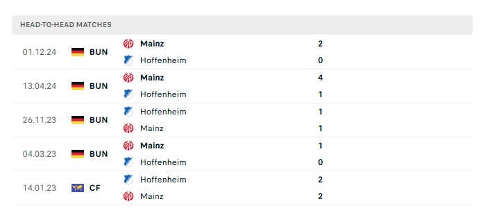 Lịch sử đối đầu Hoffenheim vs Mainz