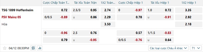 Bảng tỷ lệ kèo nhà cái Hoffenheim vs Mainz