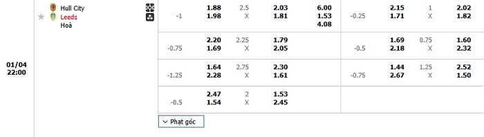 Bảng tỷ lệ kèo bóng đá Hull City vs Leeds Utd