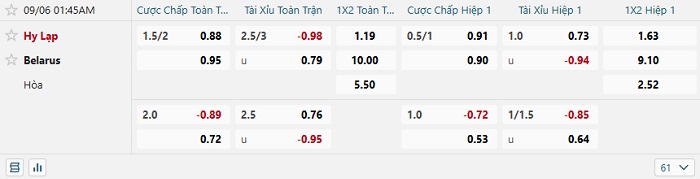 Bảng tỷ lệ kèo bóng đá hôm nay Hy Lạp vs Belarus