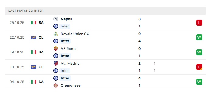 - Phong độ gần đây Inter Milan