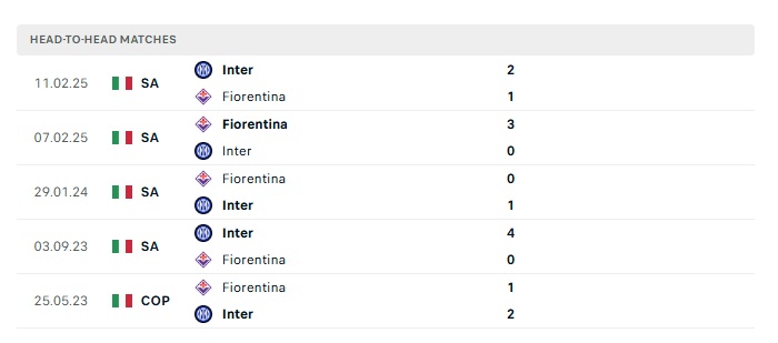 Lịch sử đối đầu Inter Milan vs Fiorentina