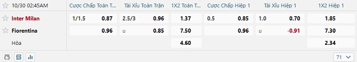 - Kèo tỷ số H1 Inter Milan vs Fiorentina: 1-0