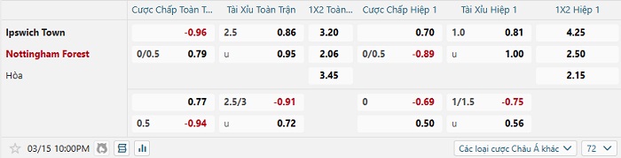 Bảng tỷ lệ kèo bóng đá Ipswich vs Nottingham Forest