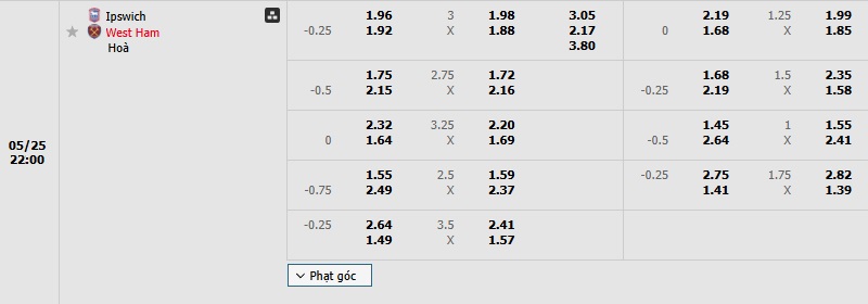 Hiện tại, nhà cái đang niêm yết cho West Ham mức chấp -1/4 và rõ ràng họ có đủ khả năng thắng kèo trước đối thủ. Trong 4 lần đụng độ nhau gần nhất, Ipswich không thắng kèo với 3 thua và chỉ hòa 1. Trong khi đó thì Ipswich trong 5 trận gần nhất, họ chỉ thắng kèo 1 và còn lại là 4 trận toàn thua kèo. Do đó, kèo châu Á hôm nay chắc chắn có đội khách là lựa chọn an toàn nhất trong cả 2 hiệp.