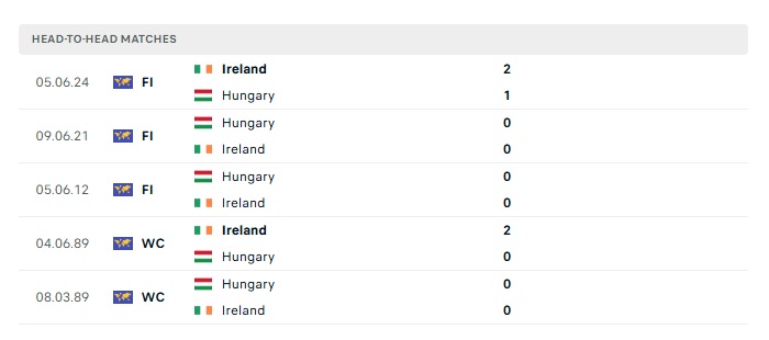 Lịch sử đối đầu Ireland vs Hungary