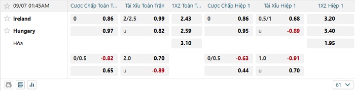 Bảng tỷ lệ kèo nhà cái Ireland vs Hungary
